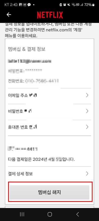 3. 멤버십 & 결제 정보에서 화면을 아래로 내린 후 멤버십 해지를 선택합니다.