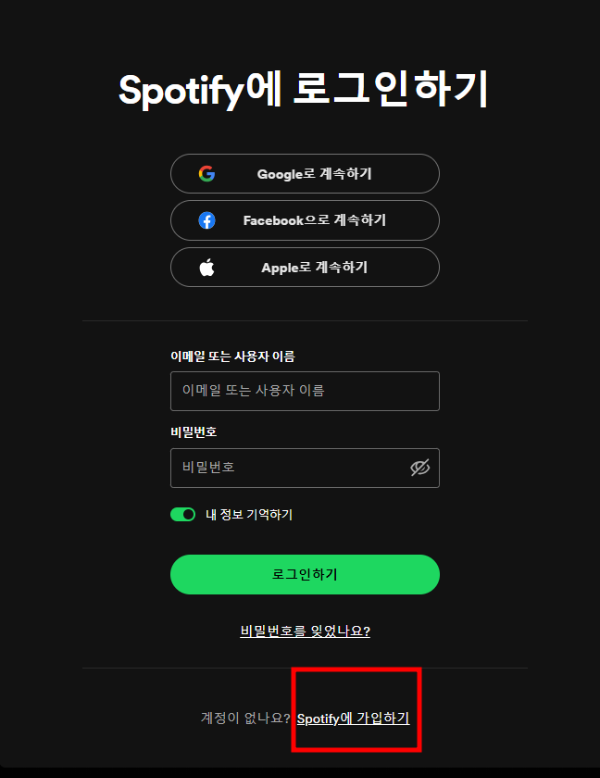 2. Spotify 가입하기를 선택합니다.