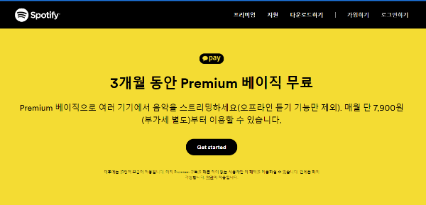 8. 스포티파이를 설치 후 로그인 합니다. 그리고 꼭 카카오페이 안내가 있던 창으로 다시 돌아와서 Get Started를 선택합니다. 카카오페이로 결제해야만 3개월 무료 체험이 적용되기 때문입니다.