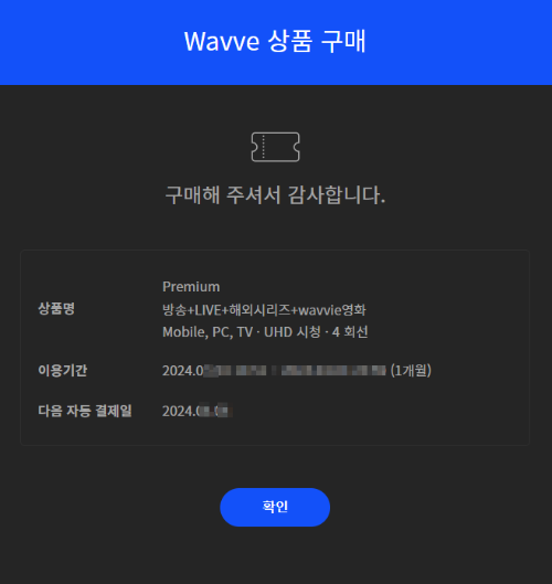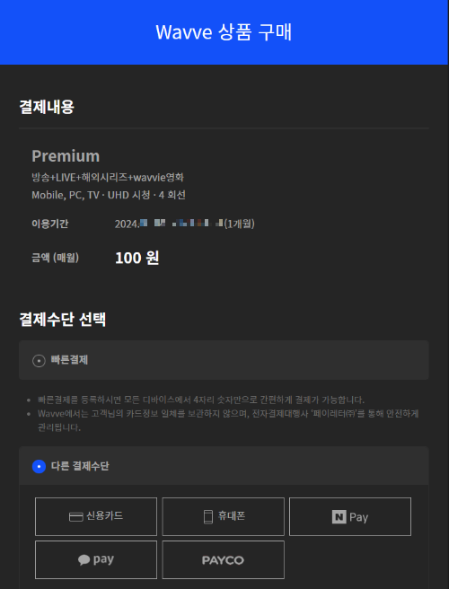 4. 결제 완료 후, 다음 결제일 (1개월 만료 후)까지 100원에 웨이브 이용할 수 있습니다.