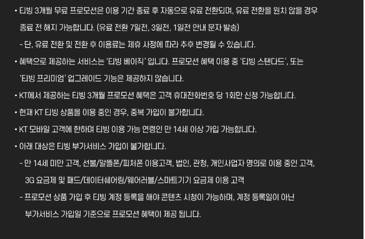 - 티빙 3개월 무료 프로모션은 이용 기간 종료 후 자동으로 유료 전환되며, 전환 전에 해지 가능합니다.